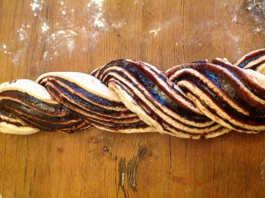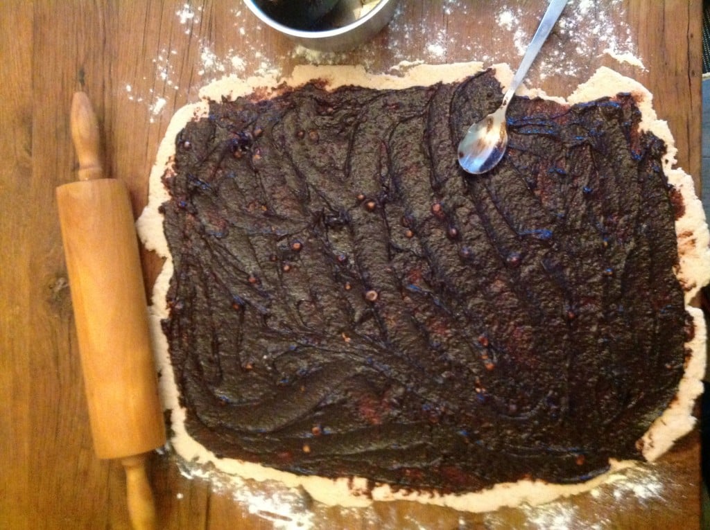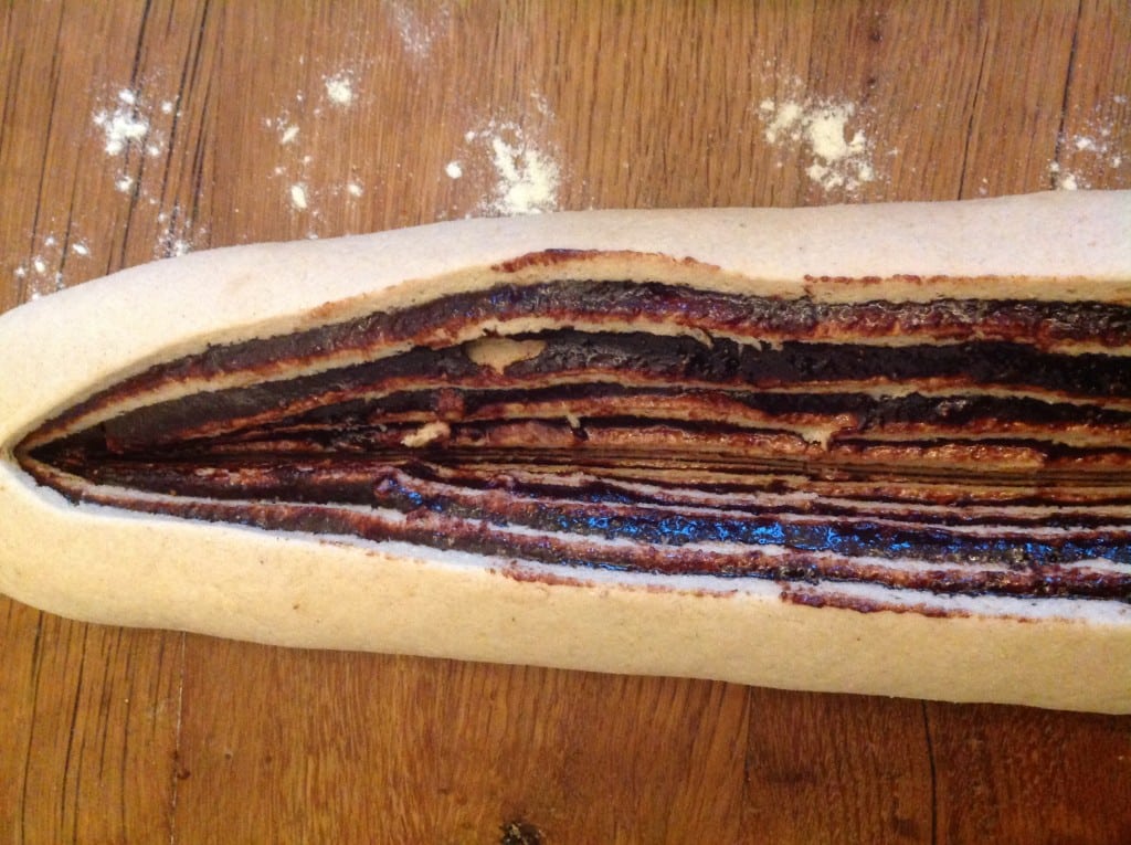 Roll the dough gently, lengthwise to a Swiss roll. Tighten well as you go.