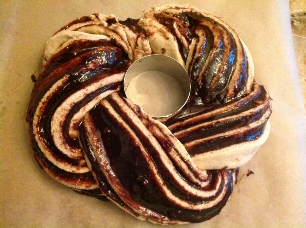 Knowing the effect of sugar, gluten and processed carbs keeps me away from those temptations but from time to time, in the name of good balance, I really feel like baking something good to spoil my beloved ones. My grandmother and mother used to bake yeast risen dough cakes every weekend and the smell of those cakes spreading out from the oven is one major happy memory of my childhood. After the success of the cinnamon rolls I went for recreating another childhood milestone- Krantz cake; a popular one among ashkenazi jews. It’s a yeast risen dough, filled with chocolate and nuts paste (or sometimes cinnamon and nuts), rolled, cut thorough and then braided and baked in a loaf tin. In the spirit of the holiday season I baked it as a wreath cake for extra WOW effect. This recipe is gluten free, wholegrain, vegan yet no less indulging, now what do you say about that?Â